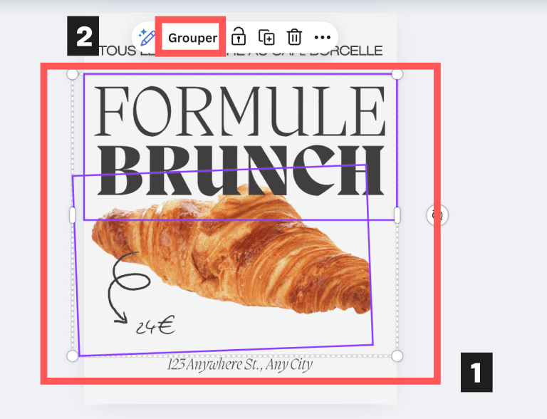 Tu peux grouper plusieurs éléments du même type (plusieurs photos, plusieurs textes, etc.) ou de types différents (photo et texte, forme et texte, etc.). Tu le fais en sélectionnant les éléments à grouper et en cliquant ensuite sur « Grouper ».
