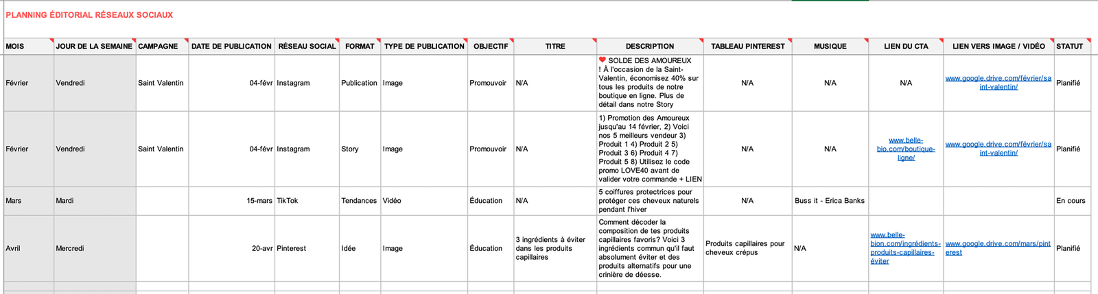Par exemple, Belle et Bio savait déjà le 1er janvier qu’ils allaient mener une campagne pour la Saint-Valentin. Ils avaient aussi toutes les informations sur la campagne c’est-à-dire tout ce qu’il fallait pour enregistrer la campagne dans le calendrier de Février. Mais ce n’est que quelques semaines avant le lancement de la campagne qu’ils ont été en mesure de remplir toutes les colonnes des onglets Réseaux sociaux, YouTube, Blog et Emails.